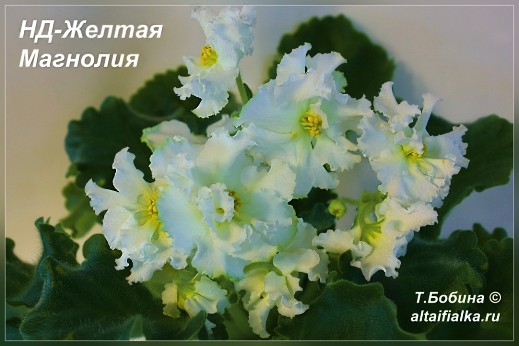 Огромные густо-махровые нежно-кремовые цветы с белыми разводами по волнистым лепесткам. Компактная розетка с круглыми зелеными листьями. См. в фотоальбоме |